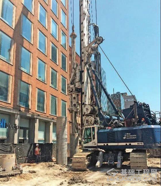 图为旋挖钻机宝峨BG 40(迪普基础)毗邻建筑进行咬合桩施工。
