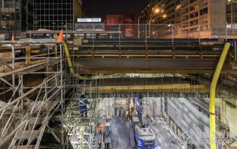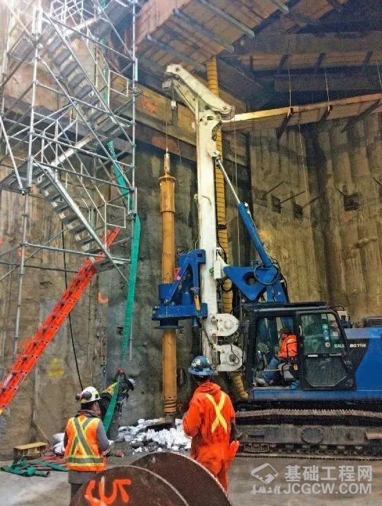 ES-3号竖井的施工分成两个部分进行,即北半区与南半区。其中北半区在空间上允许宝峨BG 40旋挖钻机从地面上进行咬合桩墙围护结构的施工,一旦钻孔结束,便在北半区架设临时桥梁,确保艾灵顿大街道路的畅通。经过一系列测量、保护,确保公共设施后,BG 40再移位到南半区域施工。大多数咬合桩均可以通过地面进行施工,但南半区域,始终有三个窗口区域因为桥梁及其他公共设施的影响无法施工,不能从地表构筑一道闭合的咬合桩墙。经过细致的方案论证,迪普基础公司选用宝峨BG 11 H钻机进行咬合桩施工,为了满足仅有9.8米高的净空要求,迪普公司直接将其桅杆头安装在下节桅杆上,从而降低了钻机的高度,施工中还配备了多种宝峨钻具,并采用了适当的施工工艺和技术,确保了钻进连续并且无任何塌方。