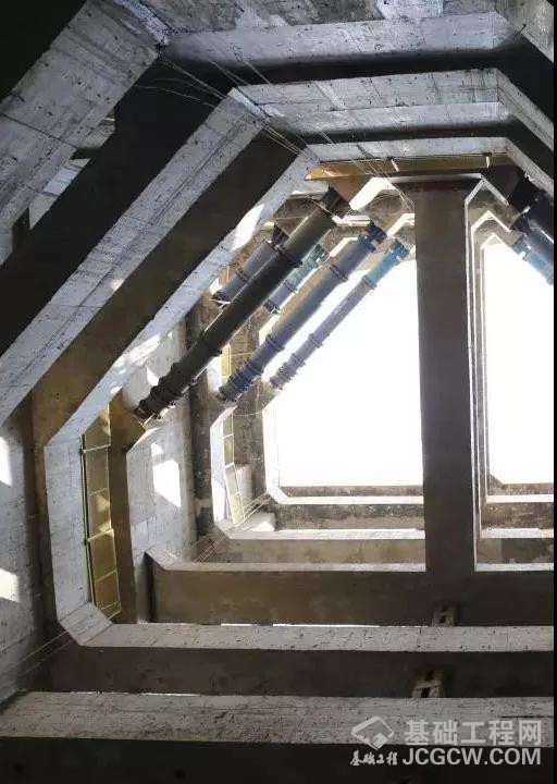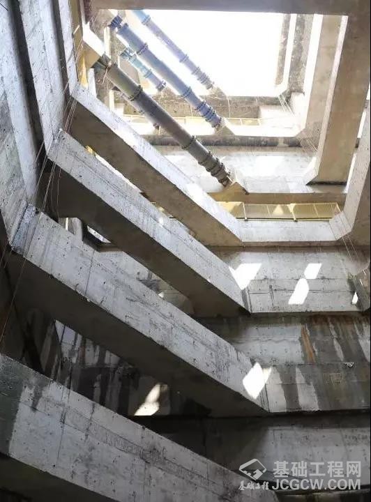 江南风井位于长河路闻涛路路口,风井主体结构尺寸20.8×28.2m,主体风井开挖深度37.754m,毗邻钱塘江,是杭州地铁建设以来最深的基坑。基坑设置九道加强框架梁作为内支撑结构,采用逆作法施工。围护结构采用了杭州首创的61m深的铣接头地下连续墙。