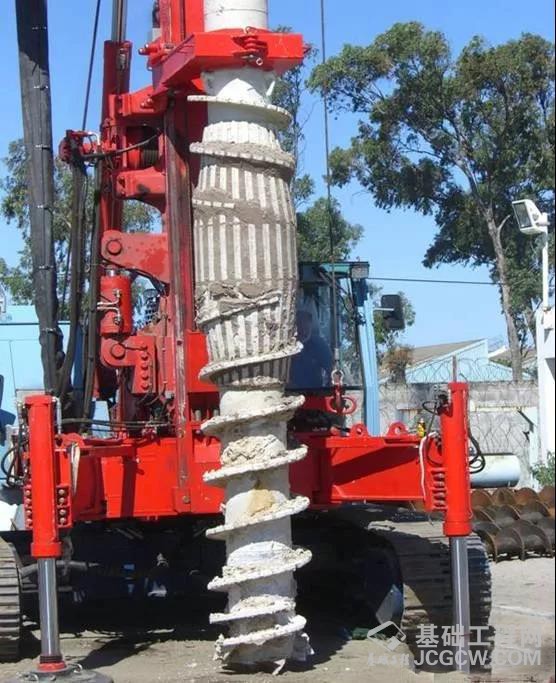 钻机定位——下钻、挤土——到达设计深度——提升挤土钻头、同时浇注混凝土——插入钢筋笼——移位至下一根桩,如图2。