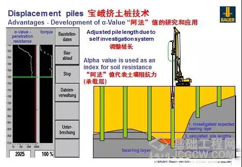 特别是宝峨FDP挤土桩施工技术,可以通过其钻进工程中监测出的“阿尔法”值,判断地层的承载力,如通过“阿尔法”值判断桩已达到设计承载力,则可以不必再钻进,反之则需要继续往下钻,直到桩基达到设计承载力。施工完成的挤土桩形成与地层实际情况相符的“长短桩”,而不是统一深度的桩基,即确保了所有的桩都达到设计承载力,又可以很大程度地节约材料。(如图3)
