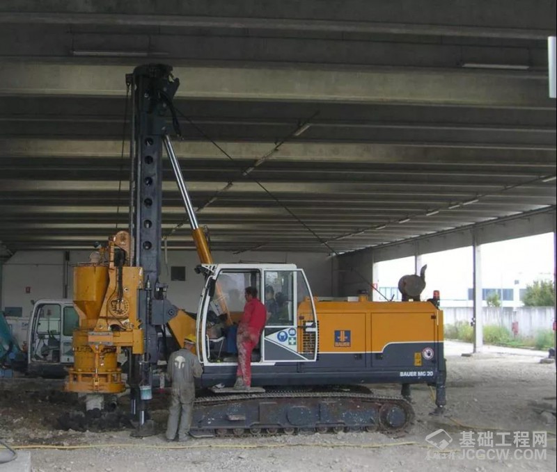 一台宝峨BG 28H钻机在德国一个仅有96平米面积(8米x12米)的场地内,采用一次桩尖FDP挤土桩(Full Displacement Pile)工法,迅速完成了直径440毫米、10米深的桩基施工,地层以粘土为主,每条桩平均钻进时间15分钟(含插入钢筋笼的时间),混凝土灌注时间2分钟。这一施工方法的成功应用,针对上述课题给出了完美的解决方案。