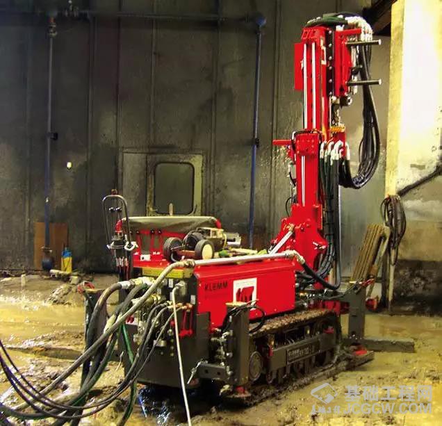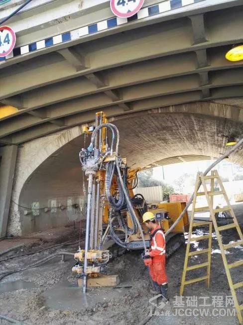 上图为宝峨-克莱姆KR 909钻机在限高4.4米的桥下进行高压旋喷施工。