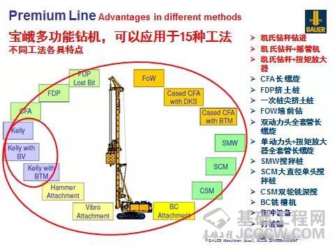 上图为在建筑物内施工的宝峨BG 39钻机,最低净空高度为18.5米。该设备为多功能旋挖钻机,能够实现以下15种工法。