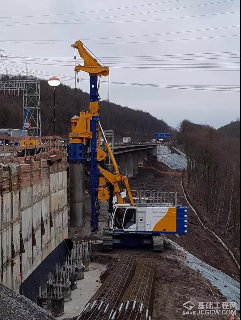 上图为配有自动护筒驱动器的宝峨低净空宝峨BG 28 H钻机进行全套管施工。