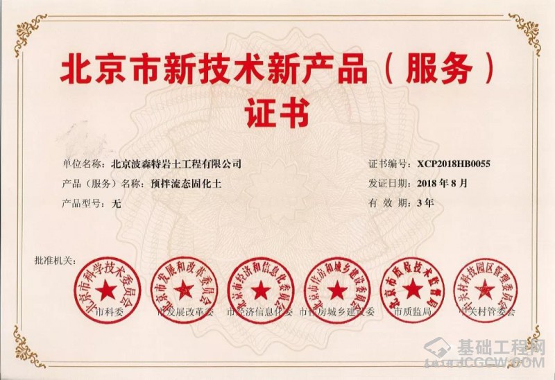 近日,由北京市科学技术委员会、北京市发展改革委员会、北京市经济和信息化委员会、北京市住房和城乡建设委员会、北京市质检技术监督局、中关村科技园区管理委员会六部门联合为北京波森特岩土工程有限公司的“预拌流态固化土”技术颁发了北京市新技术新产品(服务)证书。波森特集团多年来一直秉承着“科技创新、自主研发”的企业发展理念。自主研发的预拌流态固化土技术已获得多项国家发明专利,其广泛适用于各类市政管廊肥槽、建筑物基础、矿场采空区的回填,各种道路路基的铺设等领域。该技术及工艺成熟、适用性强、经济环保,具有极高的推广价值。此项证书的颁发是继北京市住建委科技成果鉴定证书、住建部二〇一八建筑科技成果推广证书之后,政府主管部门对该技术的又一次肯定。
