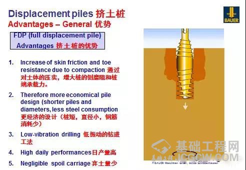 第四部分,Johann Kraxenberger先生介绍了挤土桩的原理及应用(见上图),并对一次桩尖挤土桩的施工步骤流程做了详细讲解。作为旋挖灌注桩的一种替代方法,挤土桩具有增加土壤摩擦力、优化基桩设计(缩短桩长、减小桩径和钢筋量)、低震动钻掘、渣土少等优势,可实现10小时钻进400延米的工效,实现高产值输出。