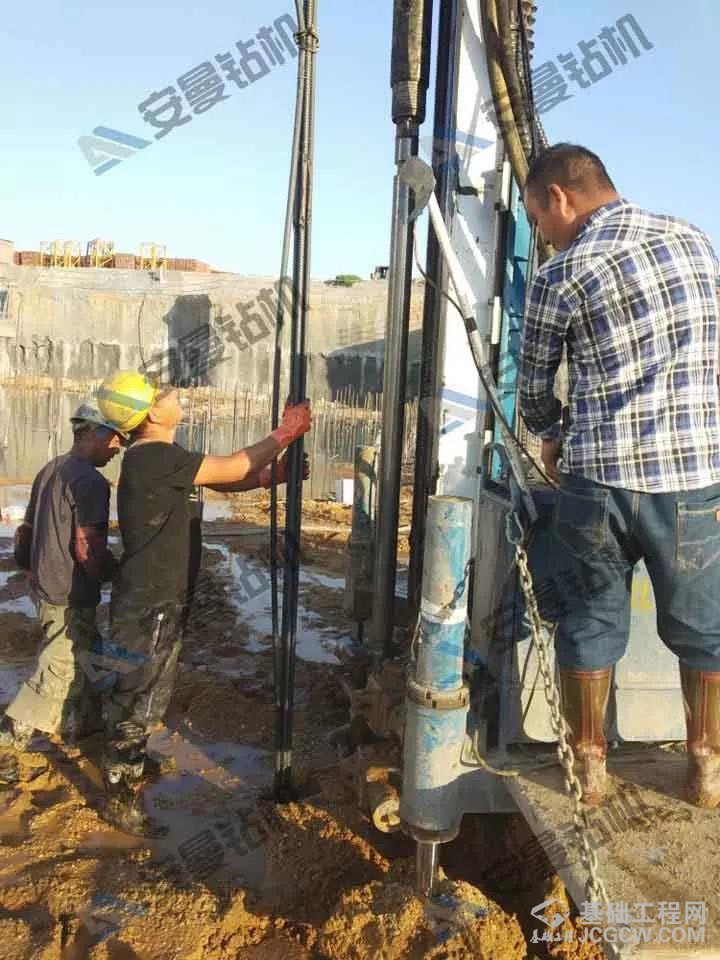 要求6米深度!打孔到7米左右!最后一根钻杆到位后,用随手吊把锚杆拉起准备好!钻杆抽完马上下锚杆!露出1米,下面6米。