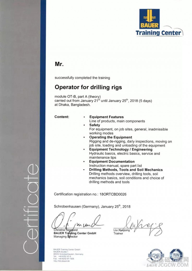 图为宝峨德国培训中心颁发的宝峨旋挖钻机驾驶员资质证书。