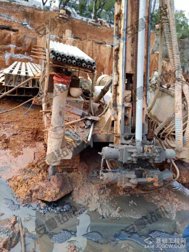 人员:机长一名,两个辅助工。现场把水池挖好,放水倒入一袋化学膨润土,搅拌均匀。要求36m,最后一根钻杆到位后,使用425纯水泥浆从钻杆注入孔直到注满,拔钻杆,使用塔吊下锚杆,之后二次注浆,一个孔结束。一个孔从打到下好锚杆1小时左右,一天8小时,轻松8根左右。