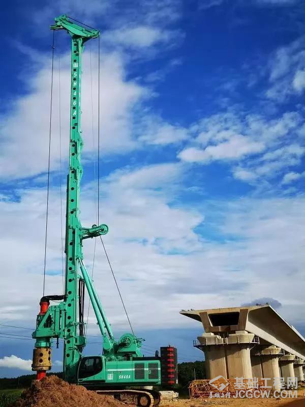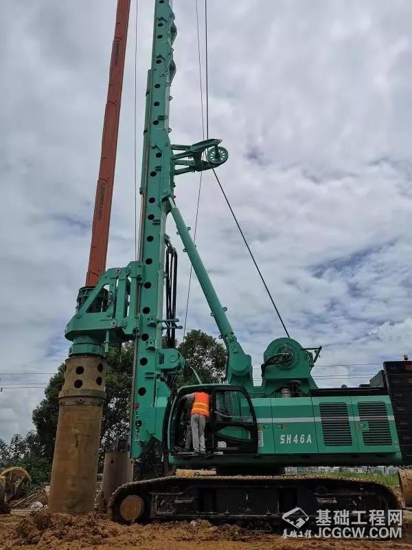 据现场了解,上海金泰的SH46A旋挖钻机不负众望,已成孔29个,最大钻进深度100.8米,平均成孔效率约40小时。其中跟管钻进:最大跟管深度72米,穿过溶洞,其中入灰岩4米,有效地解决了塌孔问题;套管及孔的垂直度达到了5‰,有效地解决了半边岩施工以及超深套管垂直度问题,满足施工要求;定位准确、精度高;真正做到旋挖钻机跟管钻进的“深、直、准”。