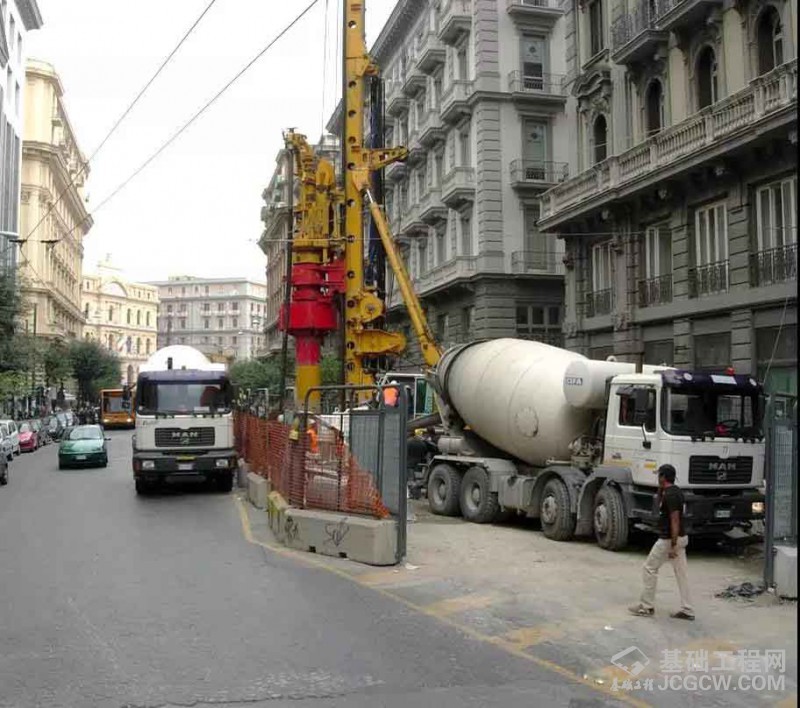 图为宝峨BG 28旋挖钻机在那不勒斯,采用CCFA全套管长螺旋工法,在非常狭窄的场地施工750毫米直径、15.5米深的咬合桩,一期桩仅需20分钟即可完成,二期桩60分钟可以完成(含插入钢筋笼的时间)。