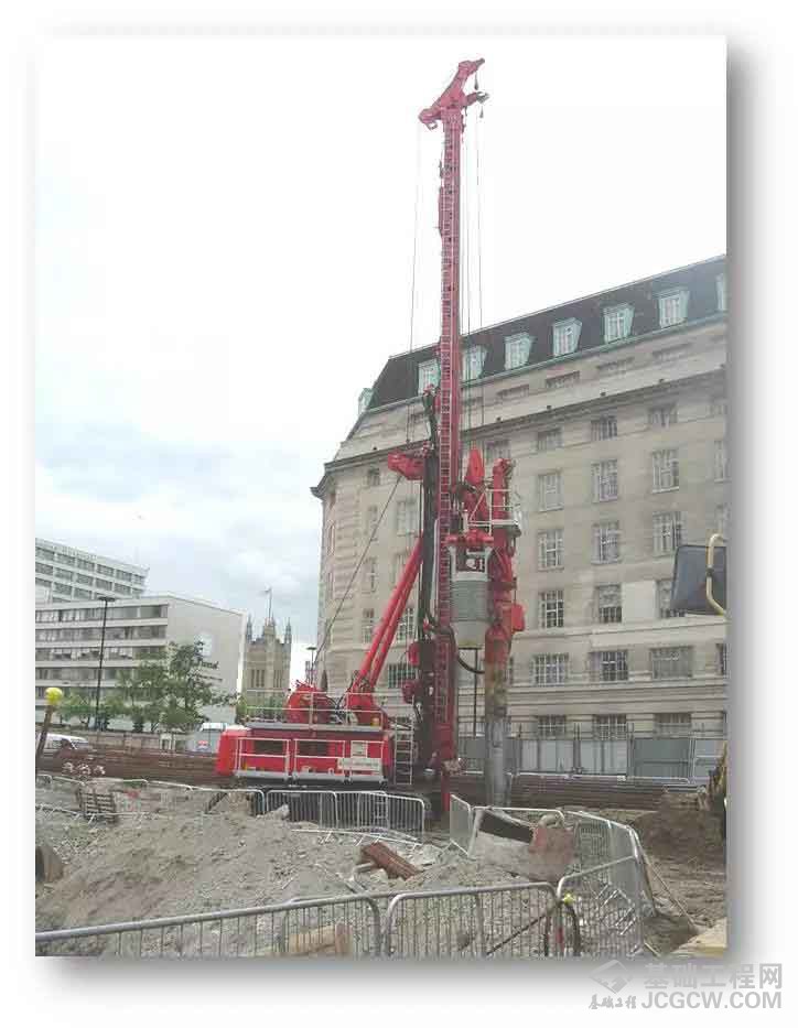 图为宝峨BG 36旋挖钻机在英国伦敦威斯敏斯特公园,采用CCFA全套管长螺旋工法施工750毫米直径、15.5米深的咬合桩,每根桩仅需30分钟即可完成。10小时可以完成310延米咬合桩。