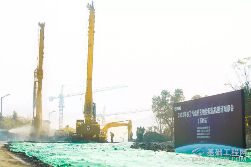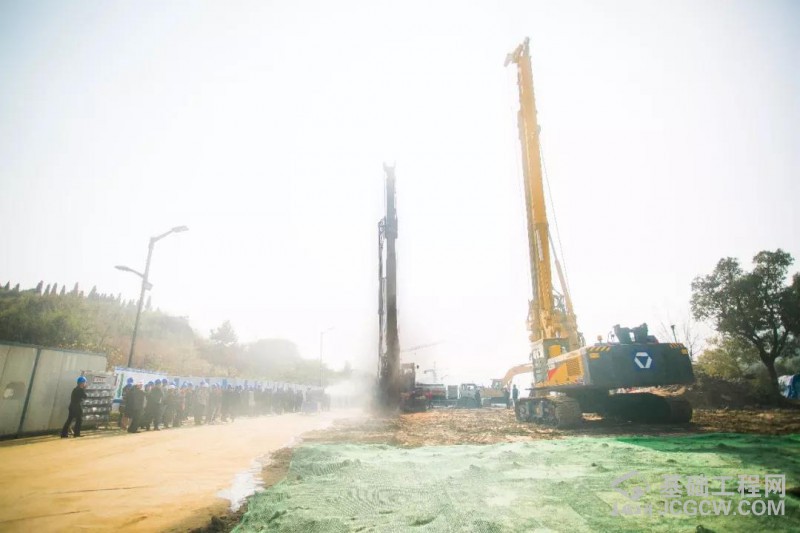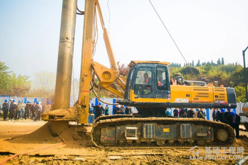 工程项目位于苏州何山路西延二标段工程,设计桩径800mm,入岩11-20m,岩石最大单独饱和抗压强度超过110MPa,采用旋挖潜孔锤工艺,施工效率达到6-8m/h,每天70米左右,一月完成1000多米,大大推进了工地工程进度。机手操作气动潜孔锤进行着演示,纷飞的泥沙,快速的成孔,令现场的参观者惊呼赞叹!大家纷纷拿起手机,记录这具有代表性的一刻。这是在徐工气动潜孔垂观摩会现场的场景,包括徐工基础公司、徐州雷曼公司、中交一公局集团有限公司、宜兴市元和劳务承包有限公司在内的全国各地100多家公司参加了观摩会。参观结束,机械行业的朋友圈自发的刮起了一阵“气动潜孔锤”的传播之风!