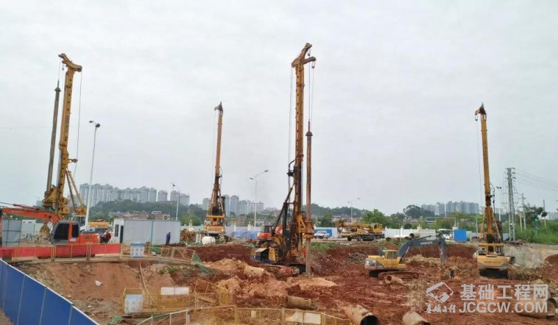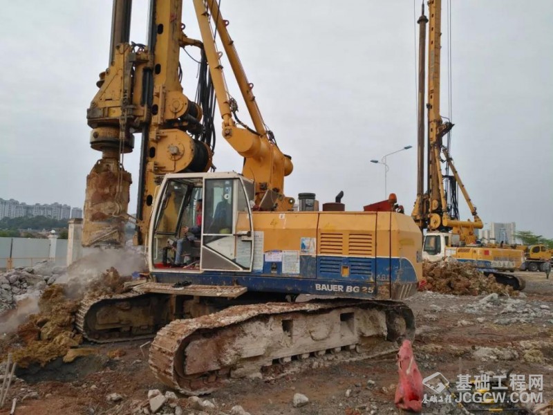 近日,四台宝峨BG 25 旋挖钻机共同参与南宁轨道交通4号线一期工程龙岗站的基桩施工,项目位于邕宁区龙岗大道,近五象大道。施工基桩桩径以0.8米及1.0米为主,桩深15~25米。南宁轨道交通4号线一期工程龙岗站主要地质条件如下:上部0~2米为回填层,紧接着为粘土、粉质粘土,厚度为2~8米不等,最后进入中风化及微风化灰岩,部分区域有溶洞,根据现场了解,这些基桩通常需要入岩8~15米。