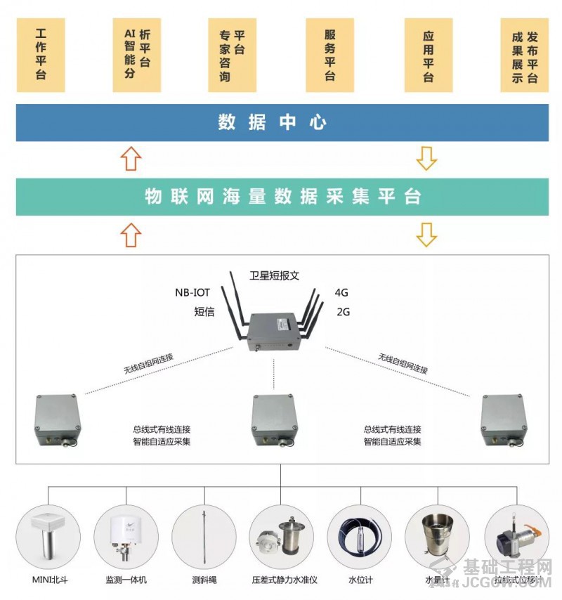 数据采集及分析服务云平台接收传感器上传的海量数据,并分布式存储;为项目承包商提供多租户多项目服务平台;提供智能化数据分析功能。
