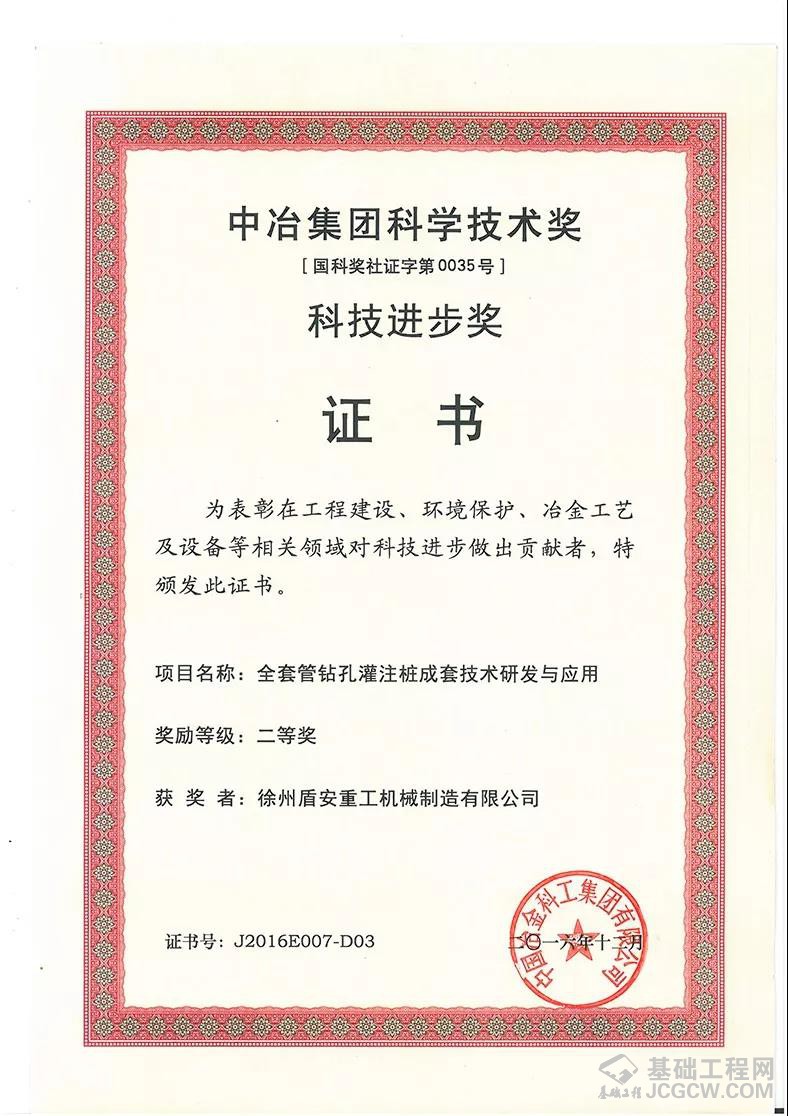 盾安重工《全套管灌注桩成套技术及装备研发与应用》项目先后获得中国冶金科工集团有限公司科技进步奖二等奖、中国施工企业管理协会科学技术奖科技创新成果一等奖。