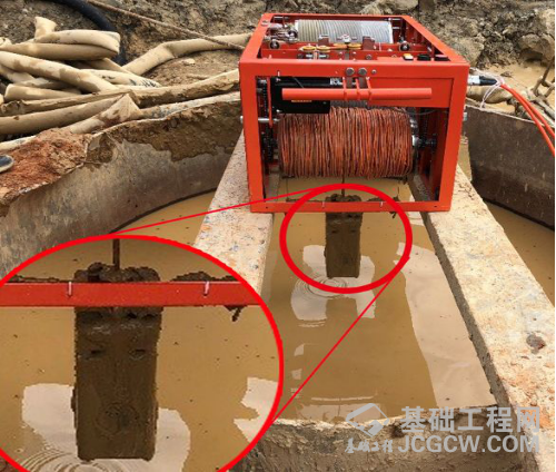 2018年1月,上海“深邃工程”云岭西项目工地开始施工,本次试验的三幅150米超深地下连续墙,成槽由宝峨BC40双轮铣完成,成槽质量检测仪所配备绞车均为150米。同为150米绞车,左边为国内某知名品牌绞车,右边为铭创成孔仪绞车,体积对比反差极为强烈。同一个槽段,检测数据反映的槽壁信息基本一致。