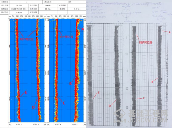 两台设备先后测试同一个孔,同一个桩孔数据对比,孔壁有A、B、C、D、E五处细节一致,孔壁整体一致。某国际知名成孔仪有2个断面能看出钢护筒位置,铭创成孔仪有3个断面能看出钢护筒位置。这证明了中国产的设备在性能上不比国际知名品牌的设备差,而价格却比国际知名品牌的要便宜,受到泰国专家的一致好评。