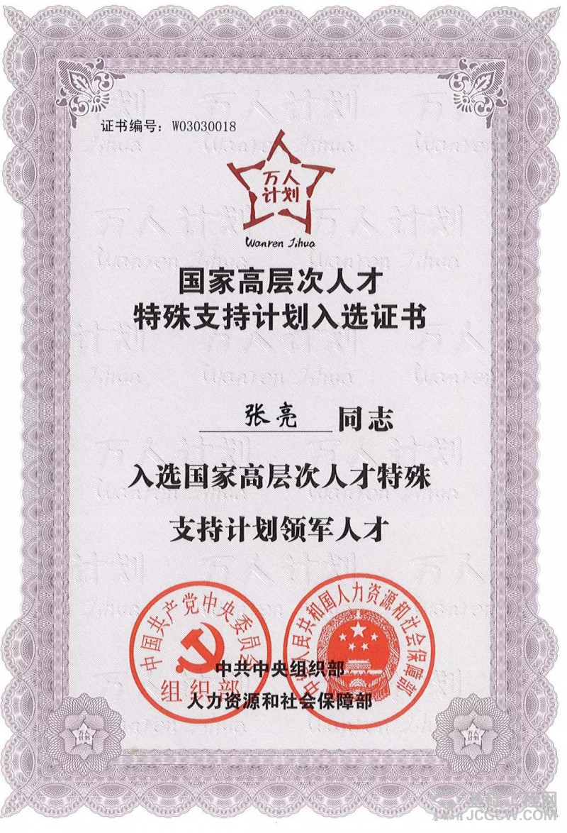 核心提示: 日前,中共中央组织部、国家人力资源与社会保障部正式颁发国家高层次人才特殊支持计划(简称万人计划)入选证书,在此热烈祝