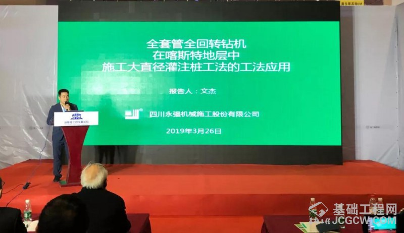 四川永强机械施工股份有限公司工程部经理文杰做《全套管全回转钻机在喀斯特地层中施工大直径灌注桩工法的工法应用》报告,报告中从喀斯特地层的简介、喀斯特地层桩基施工存在的问题、喀斯特采用全回转钻机施工工法的优势以及全回转施工工法在喀斯特地层施工桩基施工案例等内容讲解四川永强机械在桩基施工基础上保证工程质量的同时缩短了工程工期等丰富的实践经验。