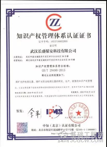 2019年3月,武汉长盛工程检测技术开发有限公司和武汉长盛煤安科技有限公司分别收到由中知(北京)认证有限公司的认证审核颁发的《知识产权管理体系认证证书》,这意味着武汉长盛在知识产权领域获得重要认可,在知识产权管理方面得到进一步规范,公司综合竞争力得到进一步提升。