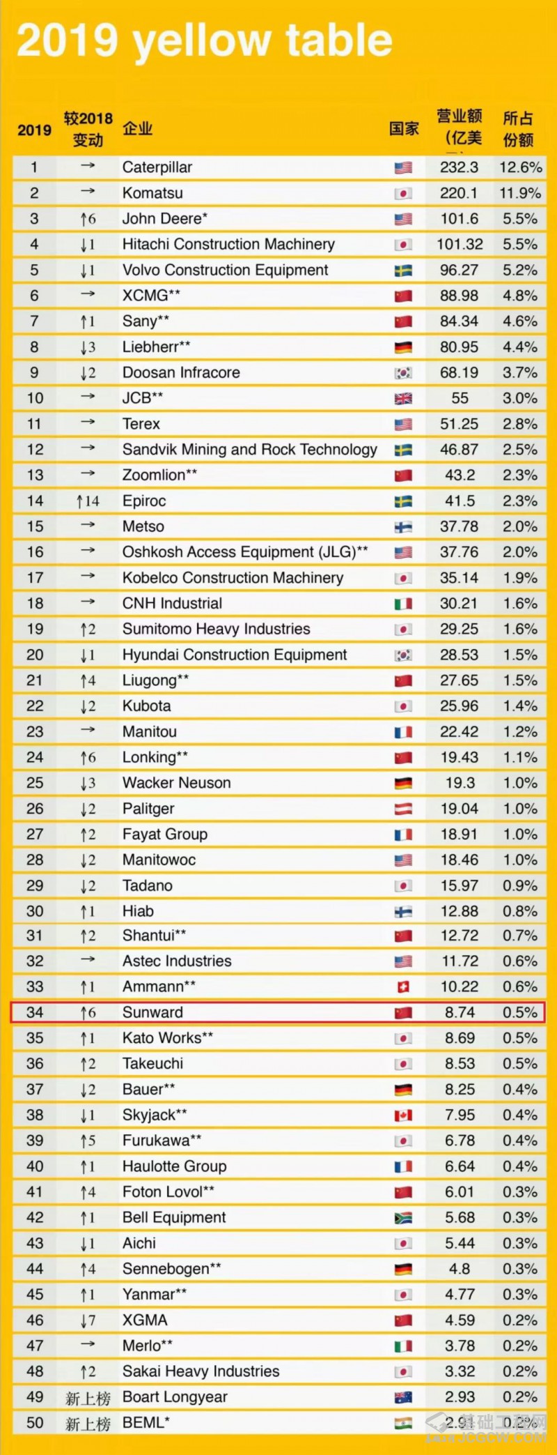 山河智能在2019全球工程机械制造商50强中的排名提升了6 位
