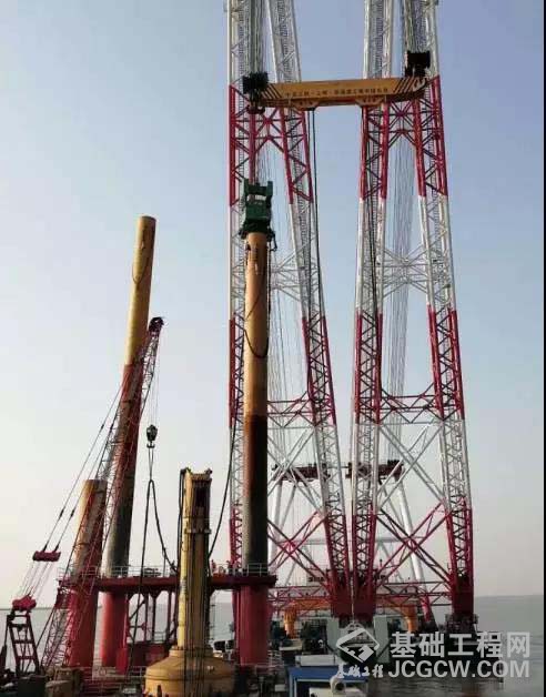 设备进行现场测试和调试之后,顺利施工。桩重约110吨,直径2.4米,桩长60米,两头壁厚30㎜,其余28㎜,沉一根桩用时约30分钟。