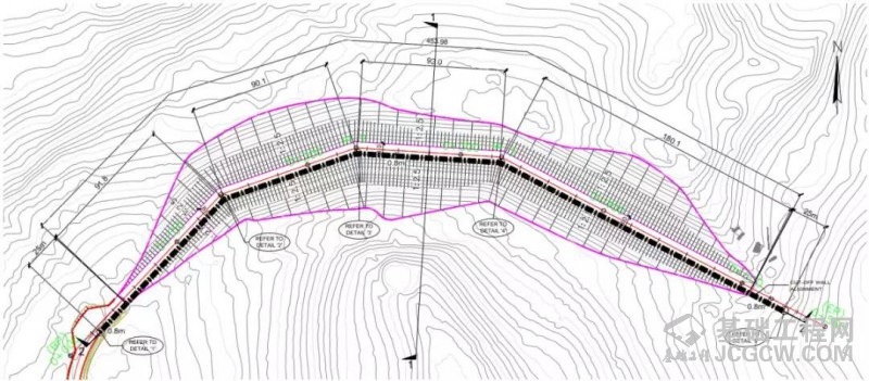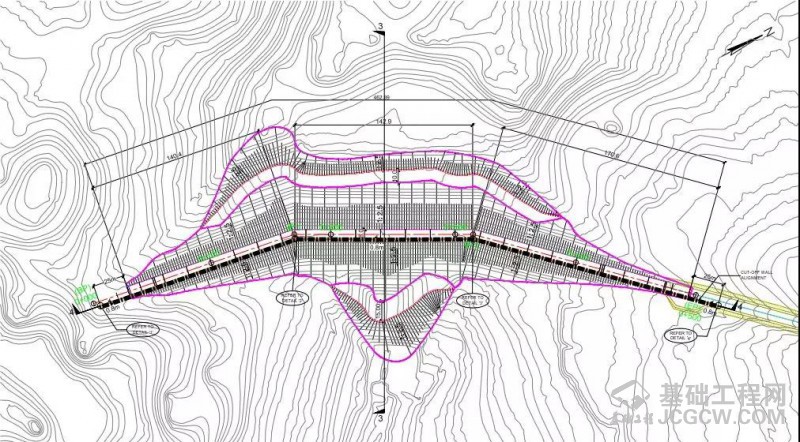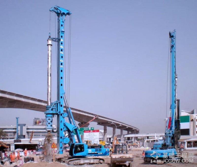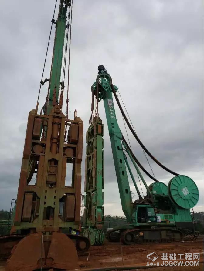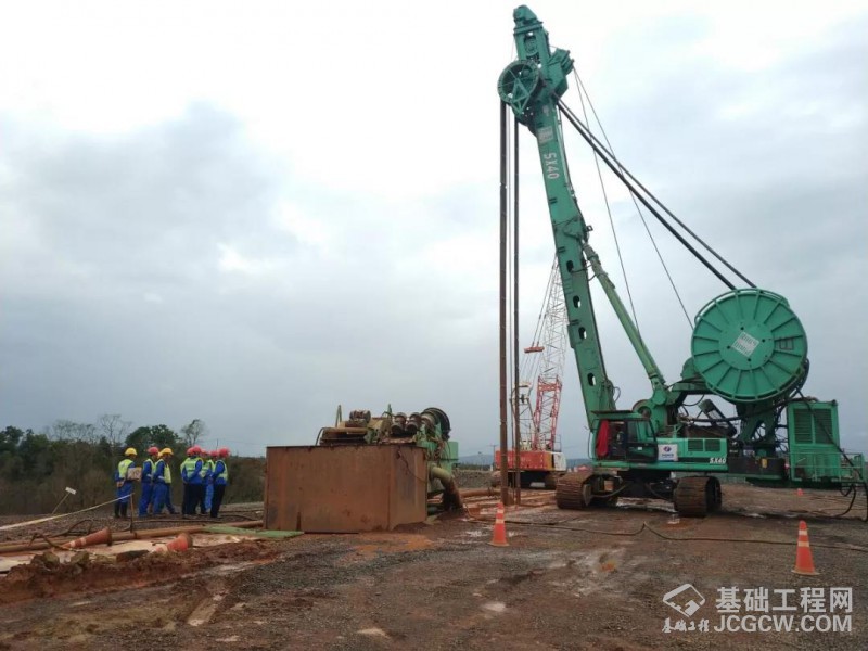 此工程两个主坝区分别为DAM E和DAM F,设计工程量分为防渗墙27,800立方米,抗滑桩146根,降压井657口。其中防渗墙部分由金泰公司抓斗SG50A及双轮铣SX40A进行施工。该防渗墙,DAM E 为74副槽,DAM F 为76副槽。 槽宽1米,深度25-35米。一期槽段采用抓铣结合,二期槽槽采用套铣结合方式施工。抓斗SG50A抓至20-34米不等,双轮铣SX40A 入岩 0.4-1米不等,个别槽段入岩7米。截至目前设备安全、稳定、可靠,施工效率平均1.5副/天。由于事先金泰公司与用户进行了深入沟通和了解,设备选型准确,符合当地施工条件。因此施工效率完全符合用户要求,得到了用户与相关国家的充分认可。