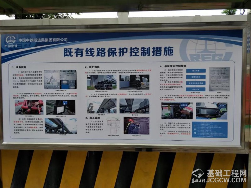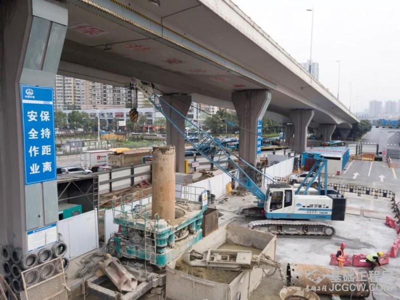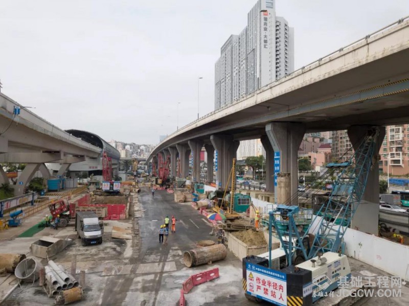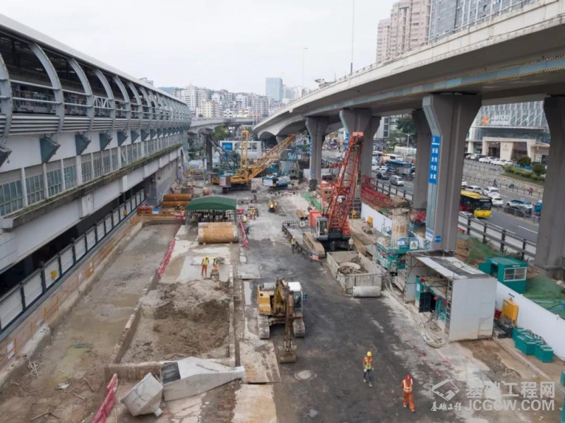 施工项目临近既有构建筑物, 3号线高架桥距离主体围护结构最近2.96m,龙岗大道布吉高架桥桥梁承台侵入主体围护结构轮廓,桥桩距离主体结构最近0.6m,地铁5号线布石区间距离车站主体围护结构外轮廓水平最小净距约为3.1m,施工可能造成周边构建筑物沉降、开裂。施工条件限高、限宽、禁用泥浆是整个项目的关键之处。
