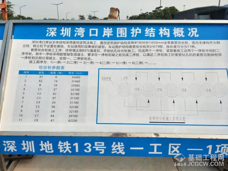 项目地点位于东滨路与望海路交叉口,设计起点历程YDK0+636.100,重点里程YDK0+973.259,有效站台中心里程DK0+790.000,全长337m,标准地段基坑宽度35.2m。基坑开挖深度约为19.8m。车站附属结构工设计有5个风亭、3个出入口、4个疏散口。本项目主体结构采用盖挖逆作法施工,盖挖逆作维护结构采用φ1800@1450mm全荤套管硬咬合桩,竖向支撑构件为钢立柱,钢立柱下设置桩基础,车站使用阶段兼做抗拔桩、车站围护结构套管咬合桩共计679根,按长度可分为11种。