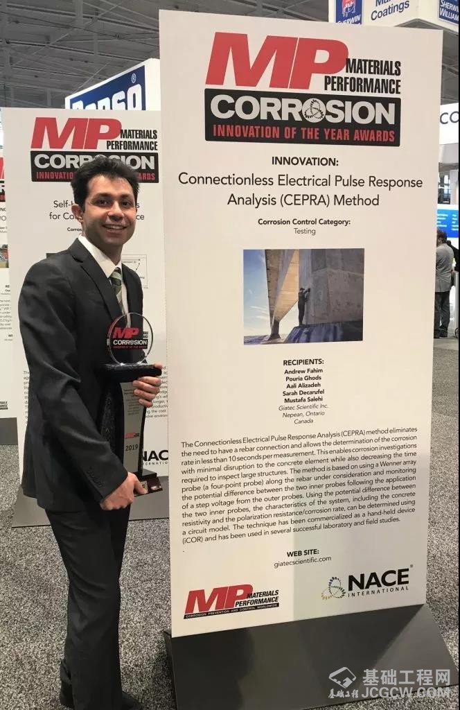 Giatec公司生产的iCOR®是评估钢筋混凝土结构健康状况的最先进的无线锈蚀测试设备,被国家锈蚀工程协会(NACE)授予2019年锈蚀创新奖。该奖项于全球最大的锈蚀预防和缓解大会——2019锈蚀大会上颁发。