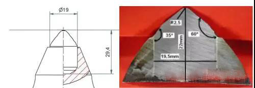 宝峨截齿的硬质合金比较长,左上图为宝峨19㎜截齿,其合金头长度达29.4㎜,而右上图的19.5㎜的、某非宝峨截齿的合金长度仅为22㎜。显然合金长度越大,使用寿命越长。