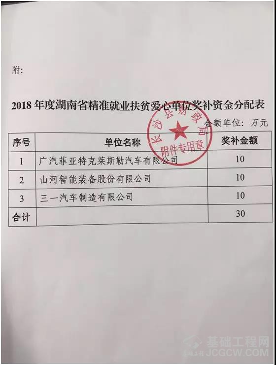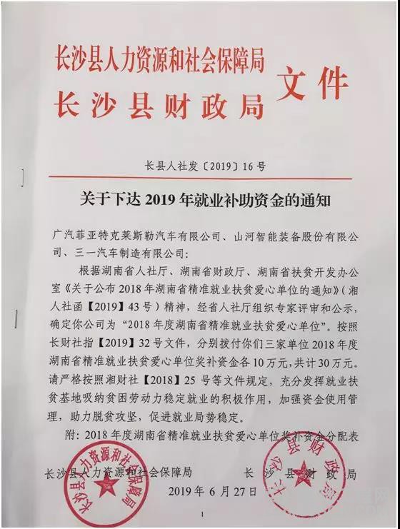 经人力资源部积极申报,通过湖南省人社厅、湖南省财政厅、湖南省扶贫开发办公室联合评审和公示,山河智能被评为2018年度湖南省精准就业“扶贫爱心单位”。同时近期获得了长沙县人社局就业补助资金10万元,长沙县仅3家单位获得补助资金。