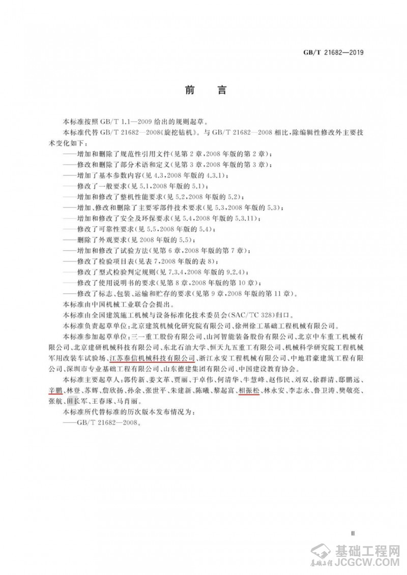 随着技术进步、实践积累、产品升级、适用范围延展等新需求和新变化,市场对旧版的《旋挖钻机(GB/T 21682-2008)》国家标准提出了更高要求,本次发布的《旋挖钻机(GB/T 21682-2019)》国家标准是由全国建筑施工机械与设备标淮化技术委员会,组织全国15家桩基础设计、施工及设备制造企业对旧版旋挖钻机国家标准进行的修订。