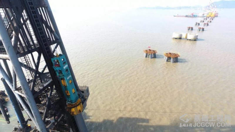 2018年三台HHP50液压打桩锤和一台HHP40液压打桩锤同时应用于舟岱跨海大桥的桩基建设,现场施工如上图。其中HHP50液压打桩锤打入最长109米(管桩直径2米)的钢管桩,创造了新的世界纪录!同时每天最多可以打入9根,打桩速度快、高效可靠,在一年多的时间共海上打入800多根钢管桩,为项目的稳步推进做出了重大贡献。