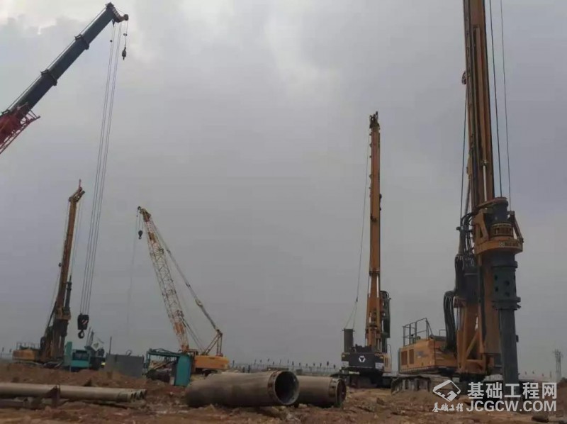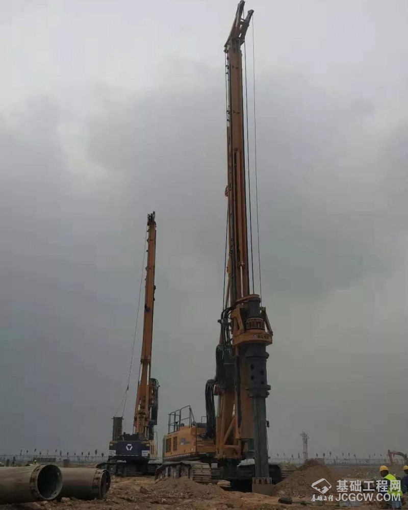 该特大钢厂占地3000多亩,此次共计成桩约3000根,桩深总共约2万多米,为全护筒施工,地质复杂多为回填土层,钻孔难度大。徐工XR360强势进入该区硬岩施工市场,不仅展现了徐工旋挖钻机作为制造业“单项冠军”的实力,更体现了其自身的特点和优势。产品采用专用H型液压伸缩式履带底盘,装备大直径回转支承,保证了超强的稳定性和运输的便捷性;采用康明斯电控涡轮增压发动机,动力强劲又环保,成孔效率高,同时满足欧III排放标准,在施工的同时保护了当地的蓝天白云;徐工专有的单排绳主卷扬结构,有效的解决钢丝绳“咬绳”问题,大大延长了钢丝绳的使用寿命;动力头施工最大扭矩360KN.m,拥有普通模式、入岩模式和节能模式,用户可根据不同的地质选择相应模式,提高了施工效率也降低了燃油消耗。