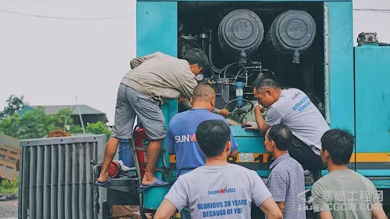 经过一番交流了解设备情况后,服务团队对SWRC170多功能全回转钻机进行全面的故障排查。据了解,这台SWRC170是山河智能设计生产的第二台全回转钻机,进入越南之后已经使用九百多小时,因为保养得宜现在依然运行顺畅良好,客户对设备的性能和使用情况非常满意。