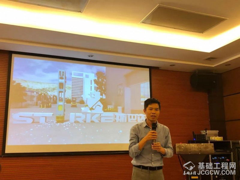 之后,由广东力源技术二部经理冯欣华向大家展示由我司研制的YZY系列斜桩设备相关技术。共展示了包括YZY300X边斜桩静力压桩机、YZY800X斜桩静力压桩机以及新研制的YZY800XJ斜搅拌桩机几项新设备、新技术。以上设备以斜桩支护技术为依托,创新性地提出可变幅静力压桩系统,可实现大角度倾斜桩的静压施工作业。
