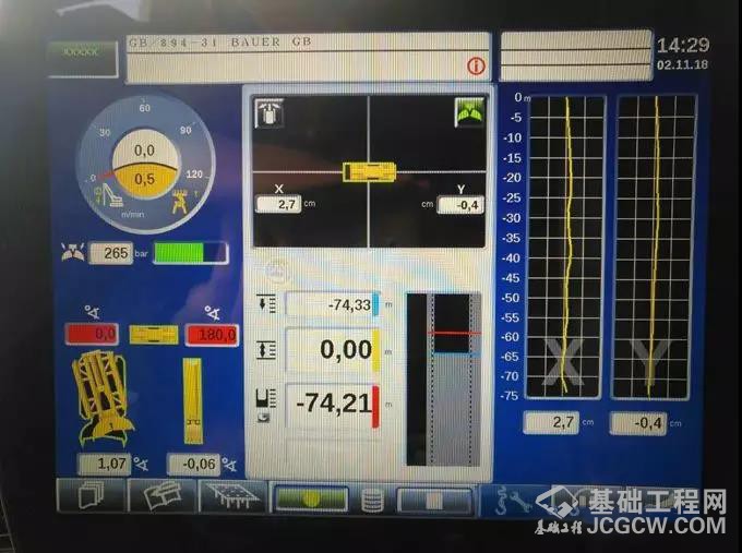 宝峨液压抓斗配有精准的测斜系统,可帮助用户控制成槽的垂直度。上图为宝峨GB 50液压抓斗在其他项目中完成1.5米厚、74米深成槽施工时的电脑屏幕显示,X方向仅偏2.7厘米,Y方向仅偏0.4厘米。
