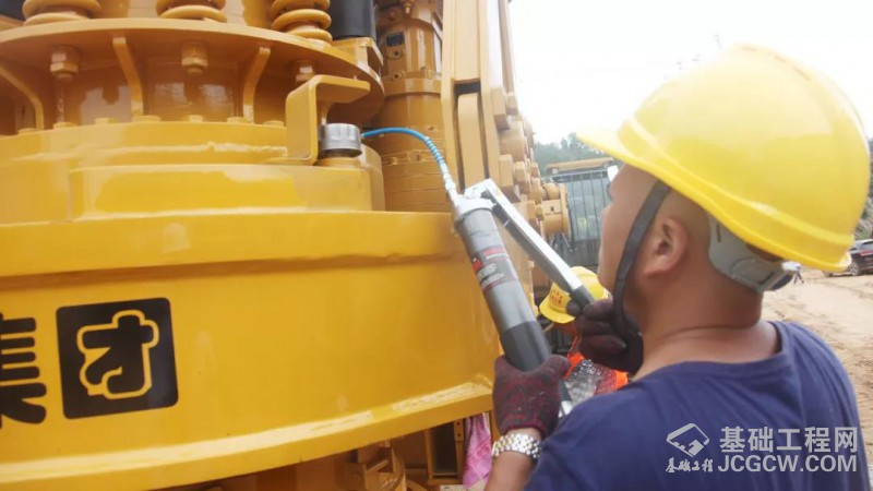 为保证新钻机首钻顺利实施,混凝土供应分公司快速行动,精心组织,仅用2天时间完成新钻机的脚踏板及平台、加压油缸、钻机鹅头和钻桅等设备安装和保养工作。