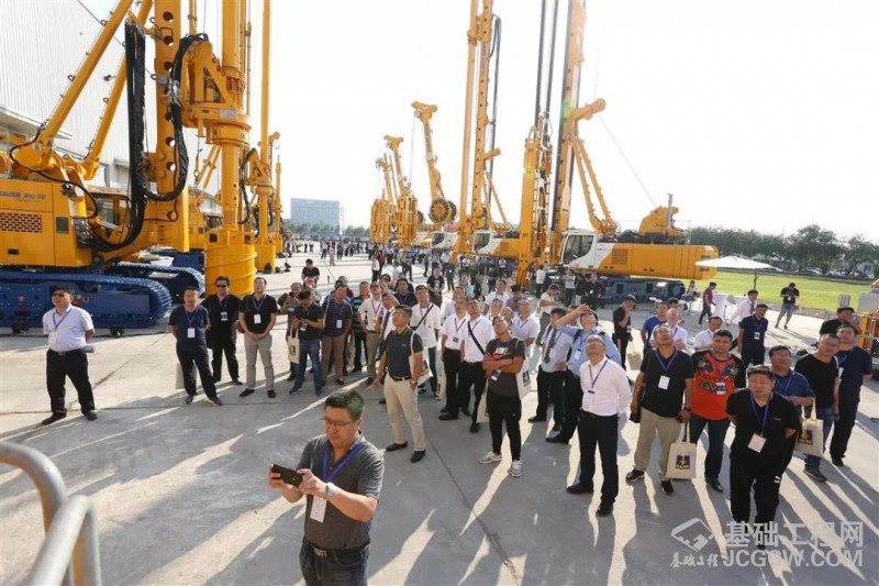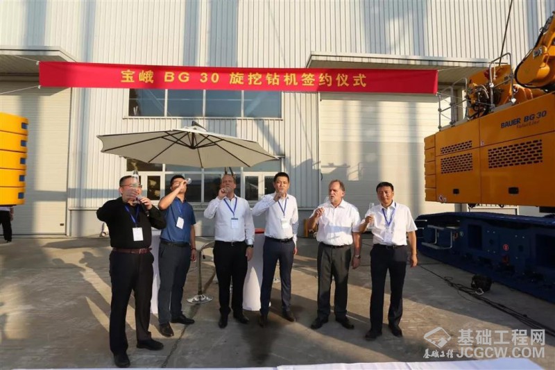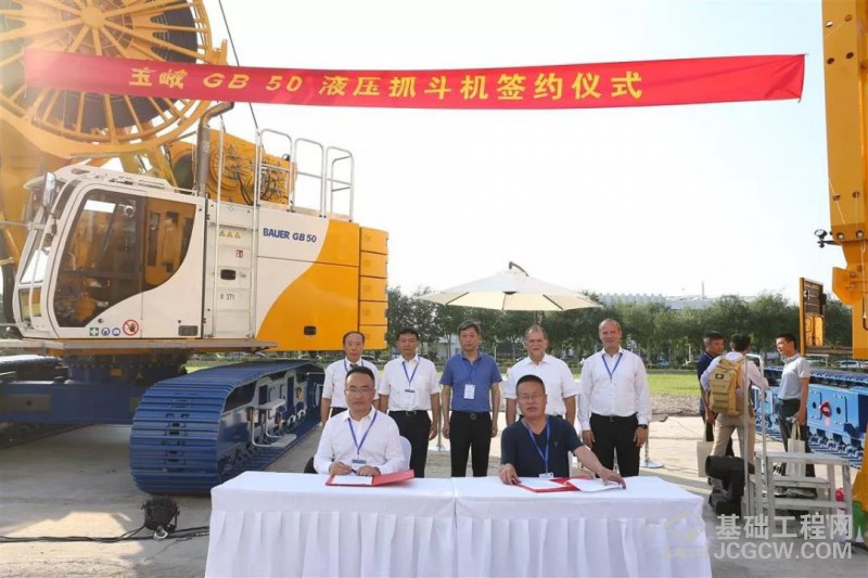 紧接着的是数场签约仪式:与南京铁义华基础工程有限公司签署了BG 30旋挖钻机采购协议、与深圳盛隆建设有限公司签署了BG 30旋挖钻机采购协议、与上海呈昊建筑安装工程有限公司签署了GB 50液压抓斗的采购协议,以及与山西烽运岩土工程有限责任公司签署了GB 50液压抓斗的采购协议。
