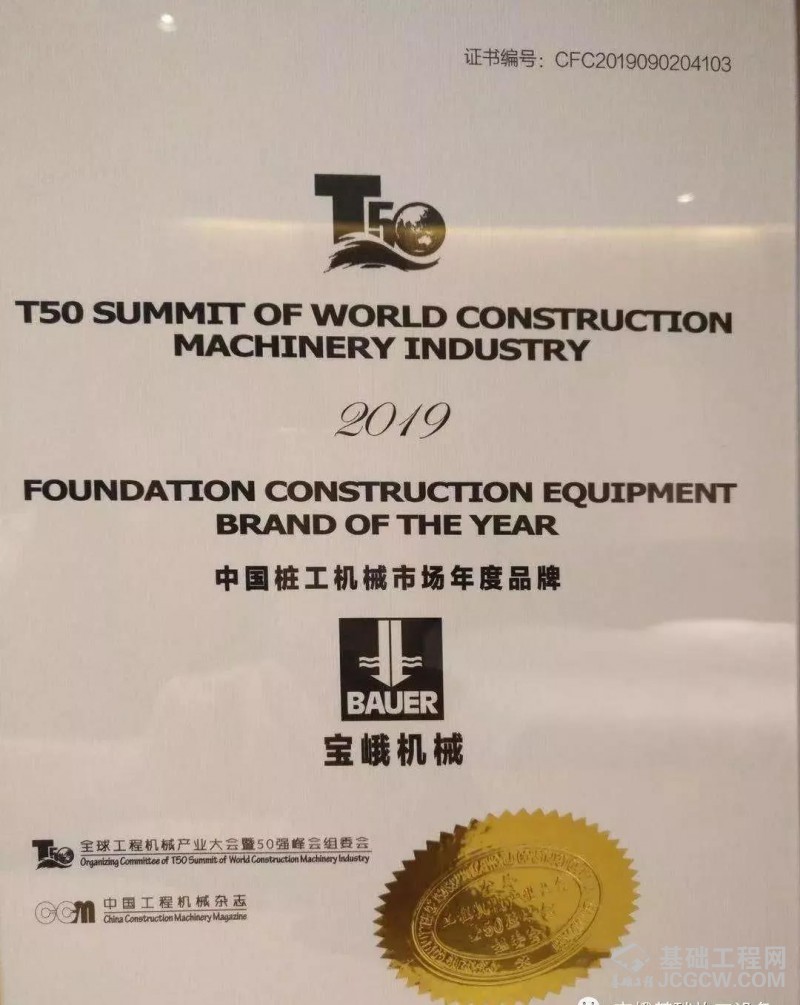 图为宝峨机械荣获中国桩工机械市场年度品牌。
