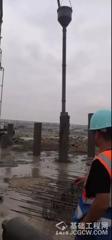➄-3层中等风化岩层为桩基持力层。施工单位:武汉峰泽胜建筑工程有限公司,采用上工机械DRA多功能套管螺旋钻机上侧+潜孔锤进行钻掘成孔,过程中钢管护壁,拔出钻掘后进行钢筋笼植入,浇灌混凝土后拔钢管。