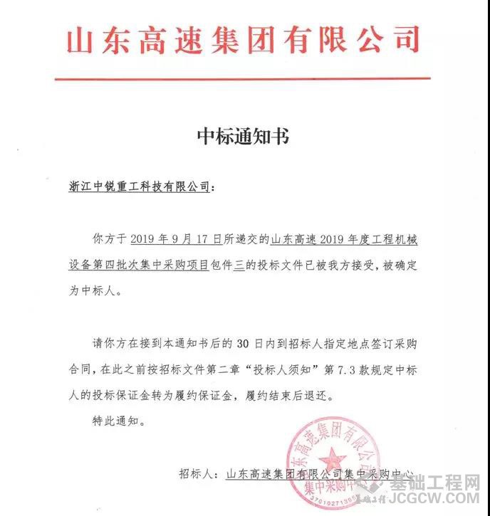 金秋十月,硕果累累!近日,浙江中锐重工科技有限公司在投标山东高速2019年度工程机械设备第四批次集中采购项目中,从众多竞争对手中脱颖而出,一举夺魁!项目业主单位为山东高速路桥集团股份有限公司,中标4台ZJD4000/350大口径全液压钻机及配套!