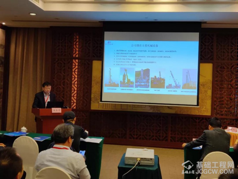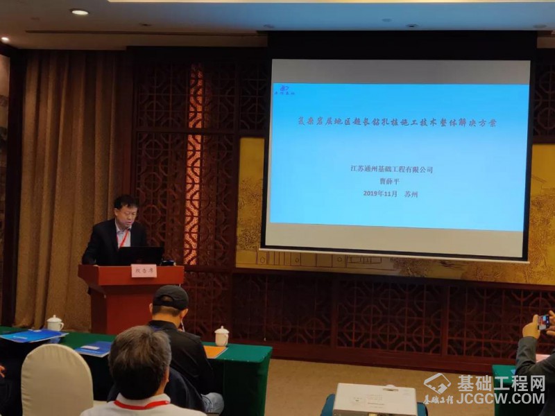 分会上,江苏通州基础建筑有限公司总经理曹薛平做关于《岩溶地区嵌岩全套管大直径超长灌注桩施工技术》的专题报告,报告中对全套管全回转钻机的工艺原理和施工工艺流程做了深刻的剖析。通过全回转钻机施工的应用领域、施工工法以及施工案例,对在复杂岩层地区底层超长桩施工需要面对的问题及对策做了详细的讲解。