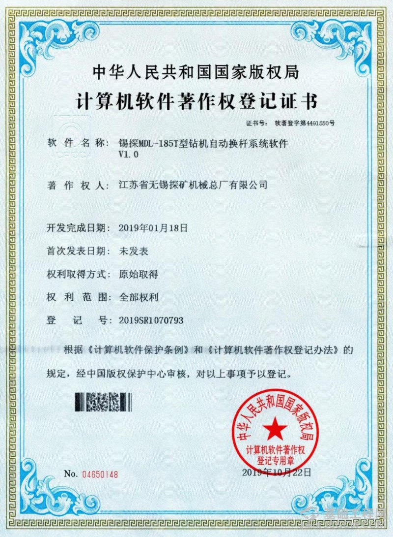 2019年11月8日,江苏锡探MDL-185T型自动换杆多功能锚固钻机操作系统,获得国家版权局授权登记,根据《计算机软件保护条例》和《计算机软件著作权登记办法》,该系统版权为江苏锡探原始取得,并持有全部权利。