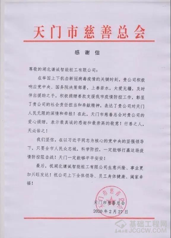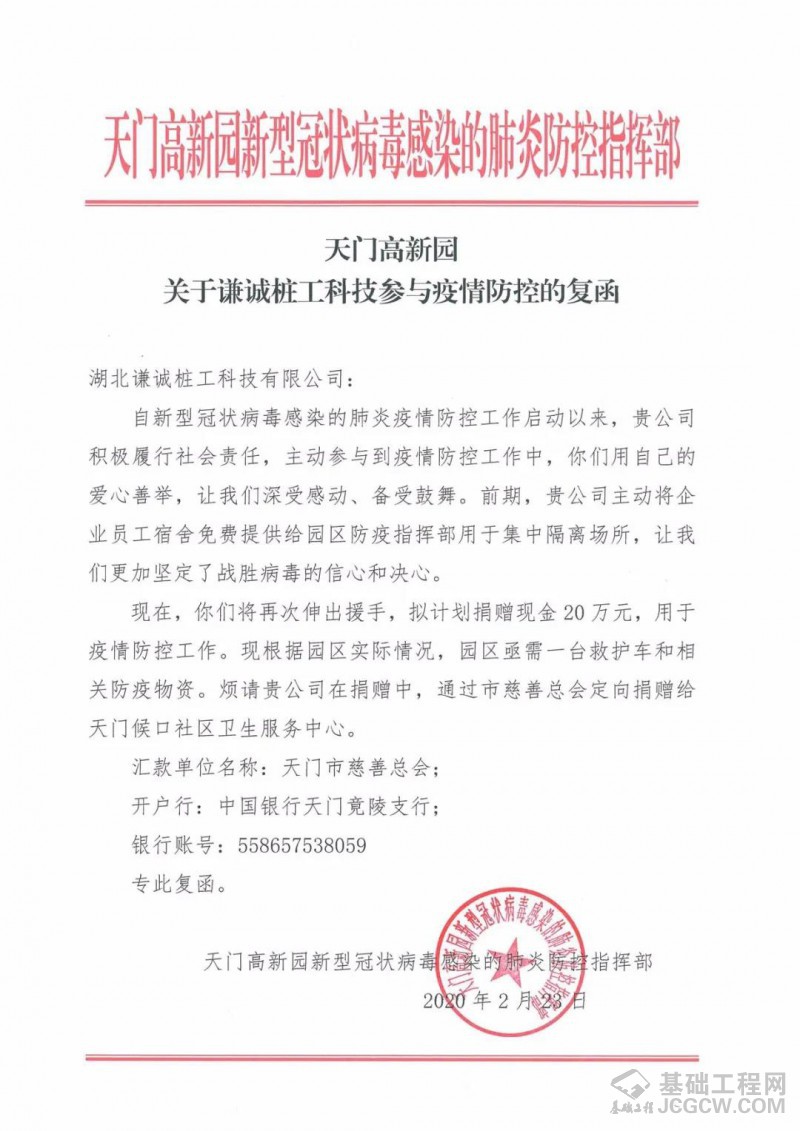 2月25日,公司分别收到天门市新型冠状病毒感染的肺炎防控指挥部和天门高新园新型冠状病毒感染的肺炎防控指挥部发来的复函,就谦诚桩工参与天门市疫情防控工作的具体事项进行对接,对谦诚桩工积极履行社会责任、主动参与疫情防控工作的爱心善举表示肯定和感谢。