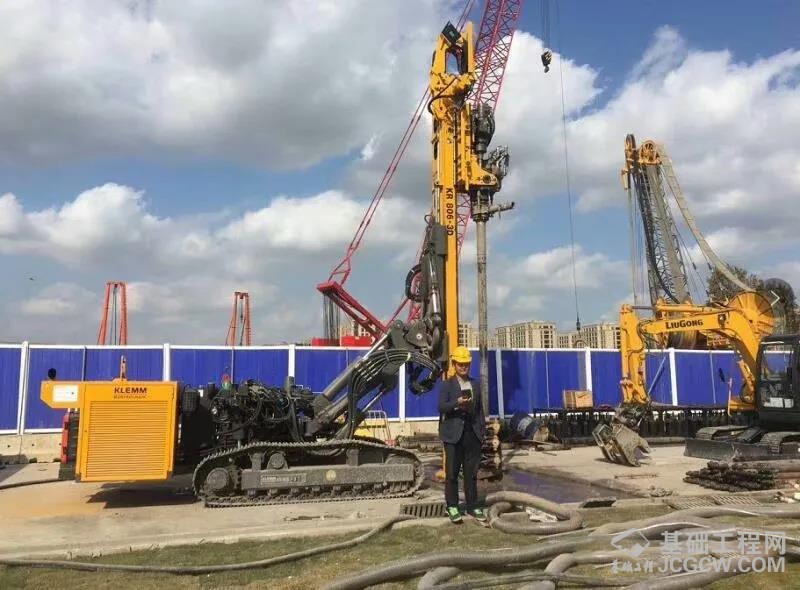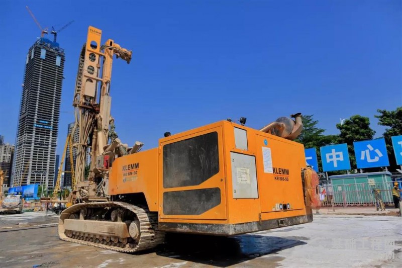 上图为北京正茂岩土公司的宝峨-克莱姆KR 806-5G钻机,在位于深圳红树湾的恒大总部基地施工灌浆孔的现场照片,该设备采用146 mm直径的钢套管穿透回填块石层、淤泥、粘土、风化岩、微风化岩石等地层,钢套管跟进最大深度达60 m。