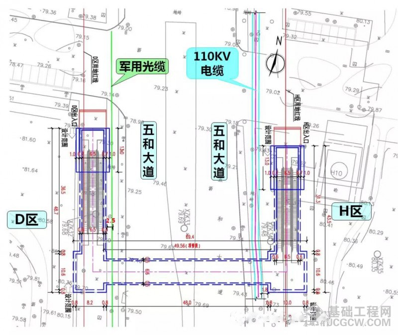 顶管下穿五和大道,由H区向D区顶进,顶进总长度为49.56m,纵向坡度为0.5%。顶管施工采用预制混凝土管节,管节断面尺寸为8.1m×4.9m,壁厚0.50m,管节长度为1.5m,重约47t;强度等级为为C50,抗渗等级为P10;管节接口采用“F”型承插式连接。为有效控制地面沉降,确保顶管段建(构)筑物以及地下管线的安全,顶管施工拟采用对地层扰动小的组合式多刀盘土压平衡式矩形顶管机进行掘进施工。